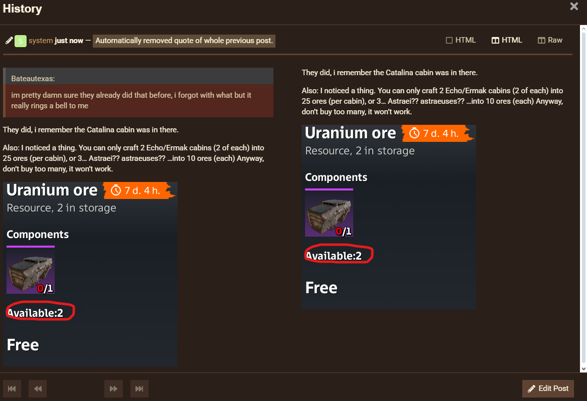 Also: I noticed a thing. You can only craft 2 Echo/Ermak cabins (2 of each) into 25 ores (per cabin), or 3… Astraei?? astraeuses?? …into 10 ores (each) Anyway, don’t buy too many, it won’t work.