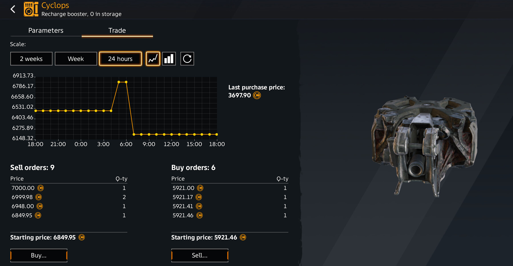 The Cyclops reloader is expensive (still or again⦠IDK), and also has the lowest sell orders of the parts I was looking at. That being said, itās still VERY close to some of the other parts, so the odds are very much against me here.