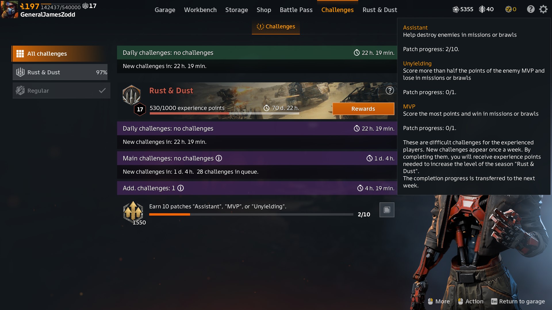 Well, tomorrow I will know if the additional challenges stack or not. I will not earn 10 assistant, unyielding, or mvp patches before 1:00 AM when the timer will end in my time zone. I have Victories of Wires and Batteries that I desire to achieve. I will not play Rust & Dust all night, just enough to earn the 5 Patches. It reads new challenges will appear when you complete the previous challenge, but this is the first time I could not complete an additional challenge within 24 hours. It also reads that the challenges update every week, but as discussed previously, there is a bug. So, is the timer counting down to the next update or the expiration of the challenge? I will know fer sure in the morning. I have only one additional challenge in the queue.
